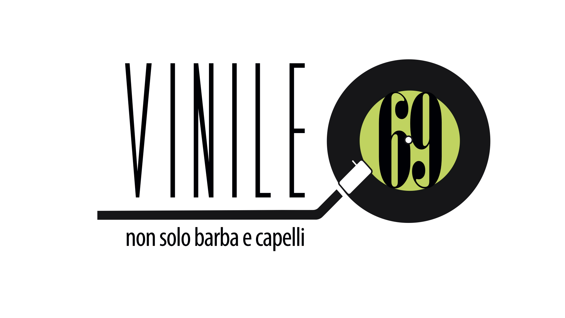 Il logo si compone del nome VINILE69, di un segmento orizzontale, barra di separazione con il testo sottostante, del payoff “non solo barba e capelli”, di un cerchio, al cui interno è presente il numero 69.