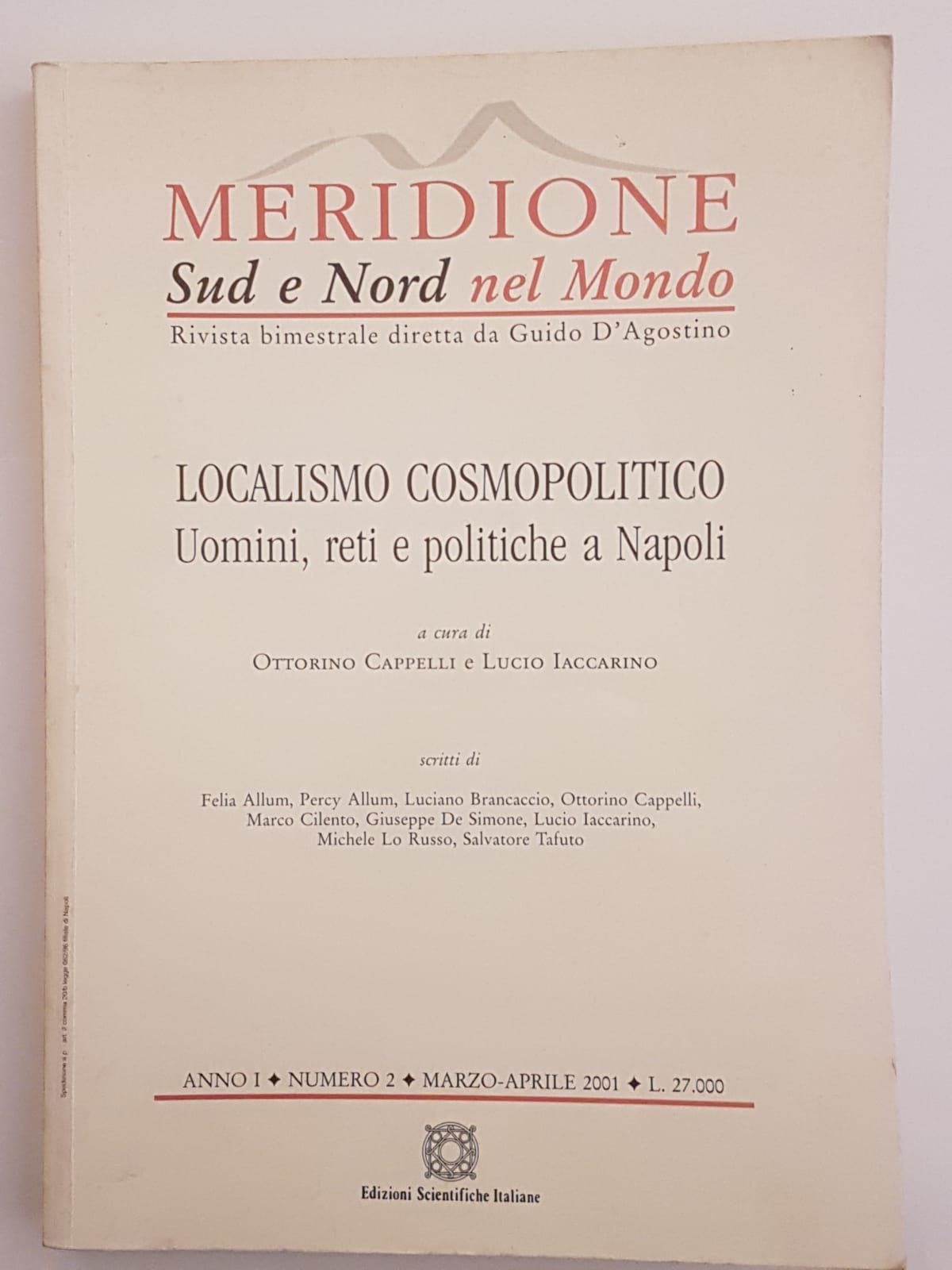 Si tratta della mia prima curatela di scritti e ricerche prodotti dal gruppo di politologi che ruotavano attorno alla figura del Prof. Percy Allum. In copertina è possibile leggerne i nomi. La Rivista Meridione. Sud e Nord nel Mondo, diretta dallo storico Guido D’Agostino ereditava in parte il portato di Nord e Sud, una delle riviste più prestigiose in ambito politologico legata alla figura del politico e accademico Francesco Compagna. D’Agostino era stato l’ultimo direttore prima del suo scioglimento.